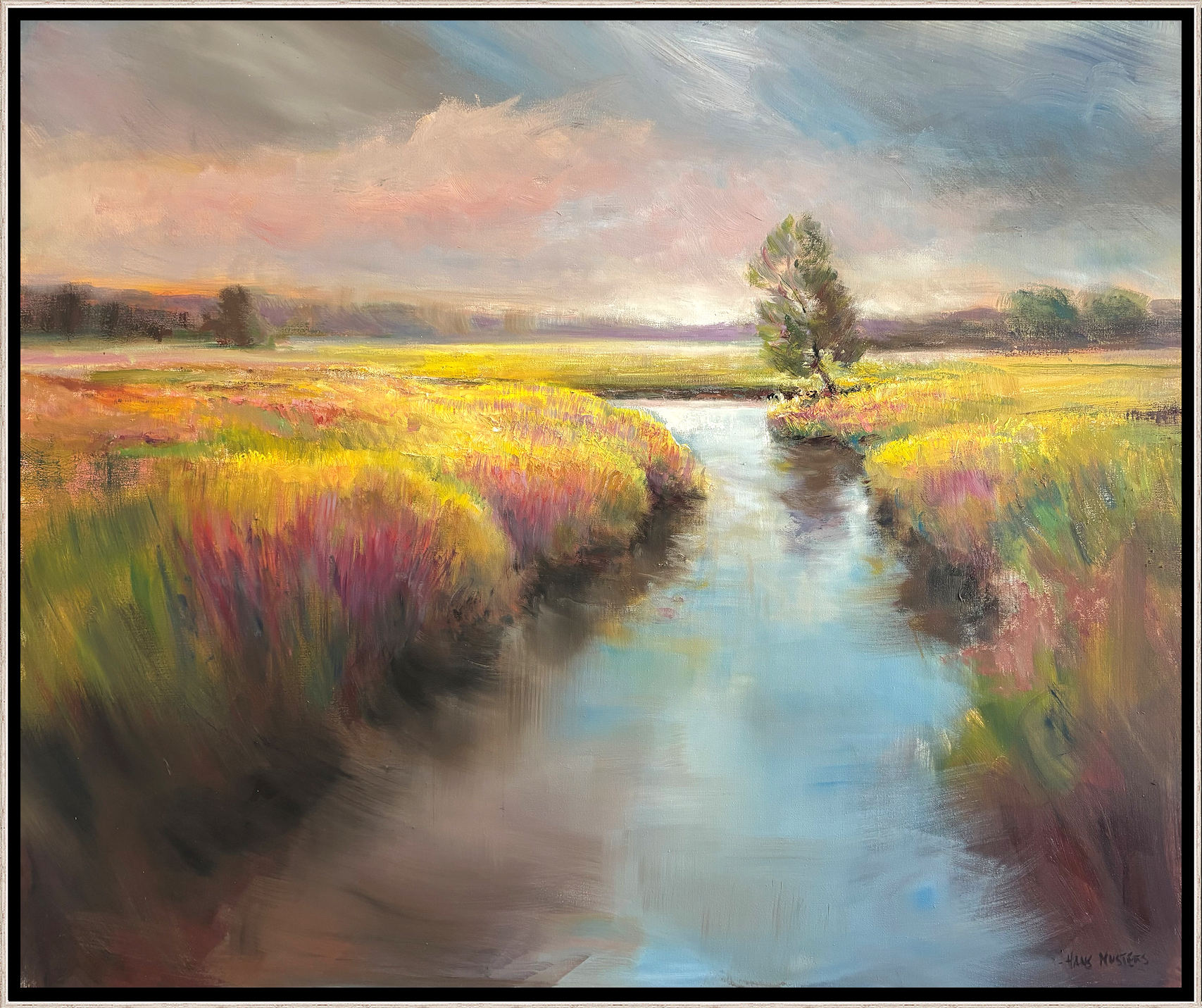 Het schilderij is 100 x 120 cm en voorzien van een zwarte baklijst. De totale afmeting is 105 x 125 cm